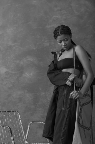 I’m Lindisiwe Mlotywa (@siwetheyrun) and I’m a fashion design student. When I walked into the space for the first time I was overwhelmingly inspired by the strong light and monochromatic, simplistic style of the room. The huge windows in the room allowed for beautiful sun rays to channel into the room during the sunset. This really set a mood for the room without needing a crowd. I wanted this mood to reflect in my concept. I used a single piece of furniture, it creates a mood of loneliness in a dark space. I collaborated with a collective called The SYX (@sogaula @yonela_makoba @xola_makoba)for styling. A monochromatic colour palette is what also led this shoot. Last but not least the photographer for the day was Mosako Chalashika (@thelosso). The shoot was really inspiring and successful.